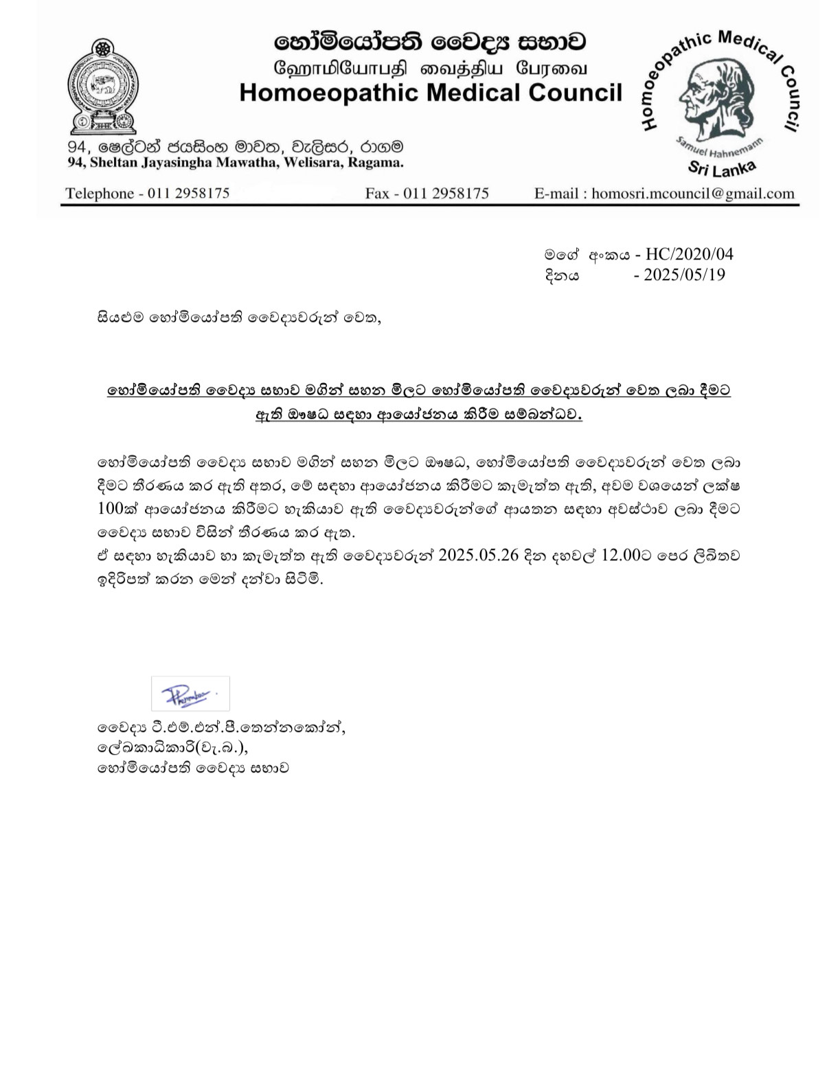 Primary objectives of the homoeopathy medical council are registration of homoeopathic medical practitioners and pharmacists, registration and regulation of homoeopathy institutions, promote, foster and regulation of homoeopathic system of medicine in Sri Lanka and for the regulation and control of manufacture, import, storage, sale and distribution of homoeopathic medicines and homoeopathic preparations.